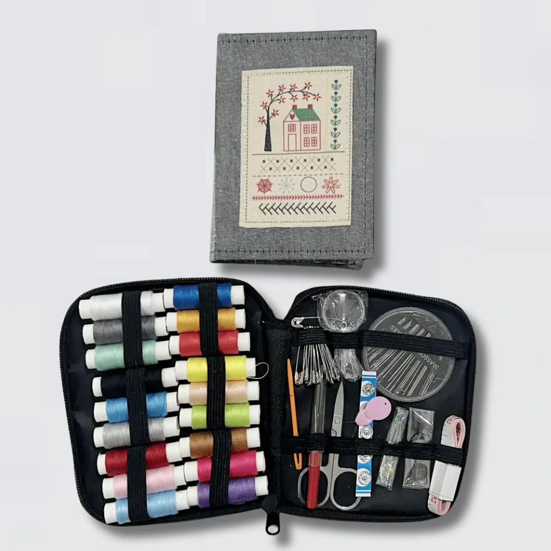 Includes 18 colored threads, scissors, seam ripper, measuring tape, magnifier, safety pins, needle threader, buttons, and a full set of needles — everything from basic mending to creative embroidery.