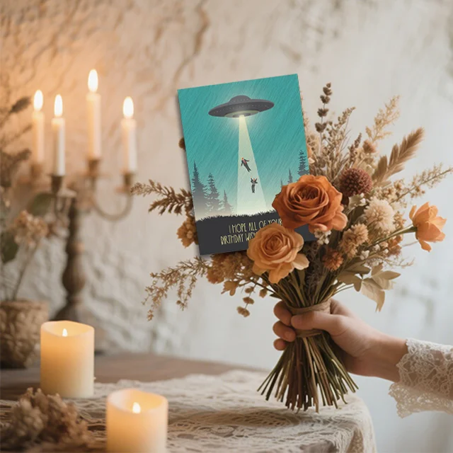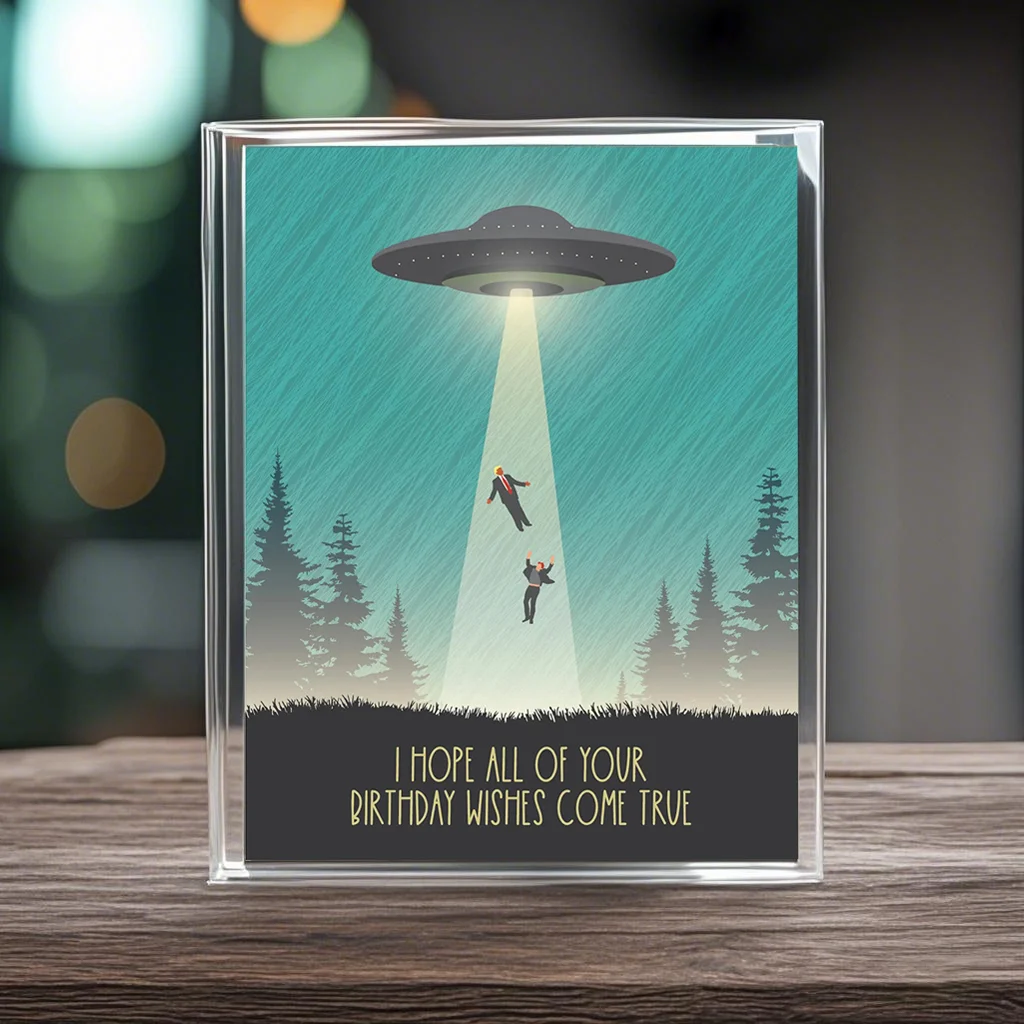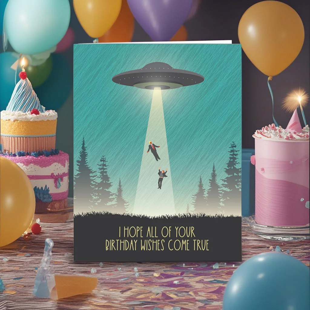 This isn’t just a birthday card—it’s a cheeky nod to those news cycles we all love to meme. Picture this: a UFO beaming up… ahem… certain controversial icons (wink wink). Printed on 100% recycled paper because saving trees > tolerating nonsense.