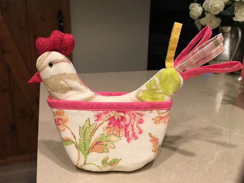 Handmade chicken pot holder both practical and cute. She comes complete with a rick-rack comb and beak and google-ly little eyes.