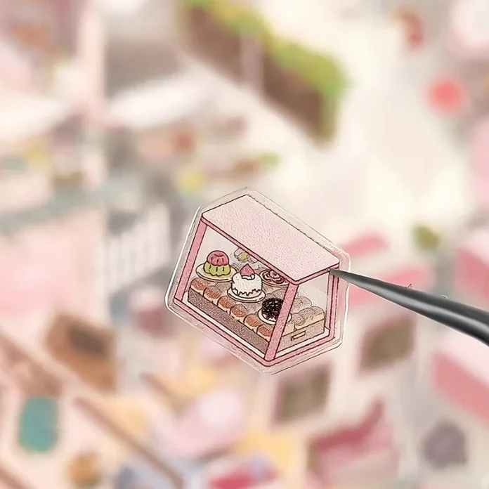 Four sticker miniature scenes: library, supermarket, resort and cinema.