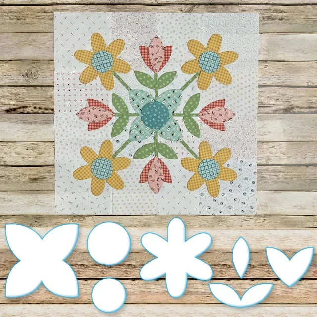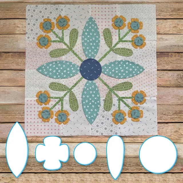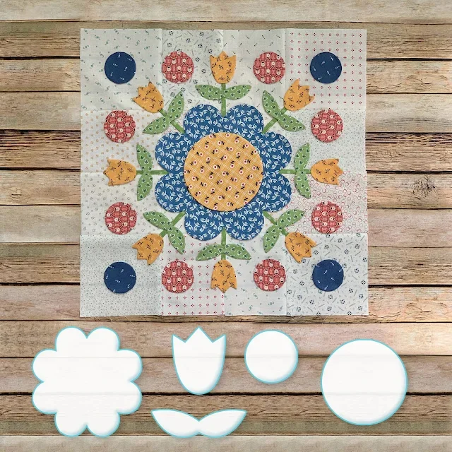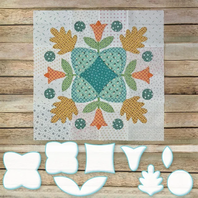 We will be making the Prairie Meadow Quilt which finishes at 68" x 85" It has twelve appliquéd blocks which we will be using my Sew Simple Shapes to make...and there are sashings between the blocksand pieced border blocks around the entire quilt that are rotary cut and sewing machine pieced. Each Prairie Block without the block borders finish at 16" x 16"