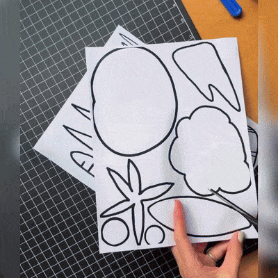 Reusable physical templates: tomato, carrot, pea pod, broccoli, radish