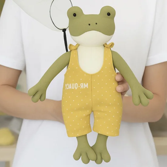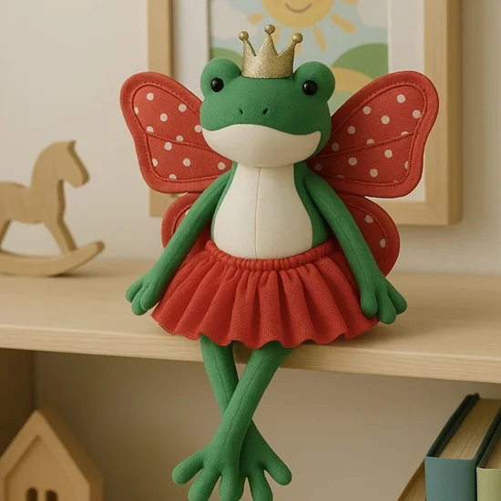 The frog's body is sewn from tactile flannel or warm cotton in a noble swamp hue, just like a self-respecting frog from the depths of magical nature.