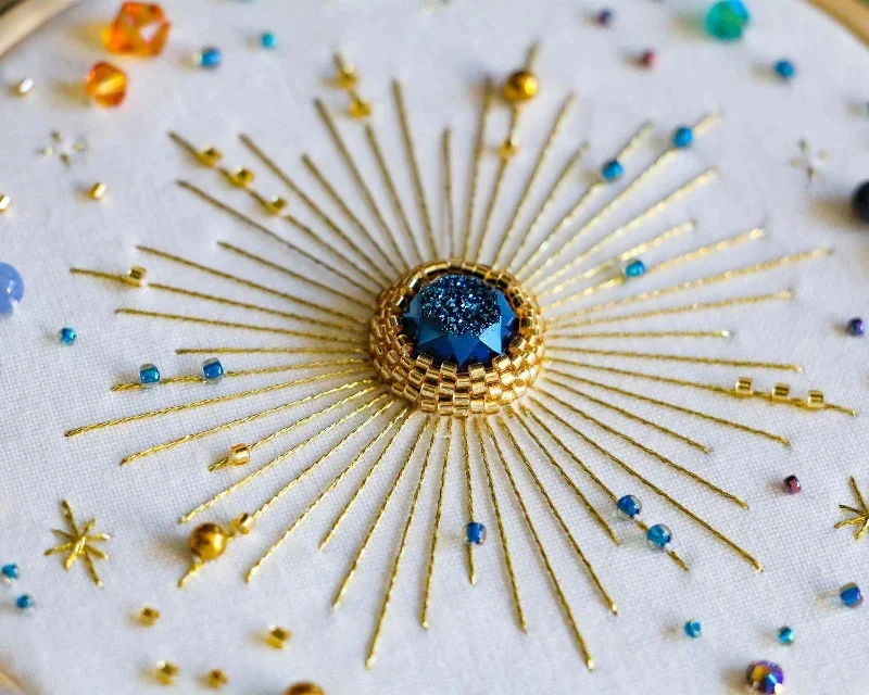 Introducing the North Star Hand Embroidery Pattern - a beautiful and eye-catching design that features golden embroidery and beadwork to create a stunning star in the night sky. Perfect for anyone who is interested in learning needlework, especially bead embroidery, this pattern is a great way to try your hand at a new craft and create a piece of art that makes a perfect home decor gift for astrology or astronomy enthusiasts.