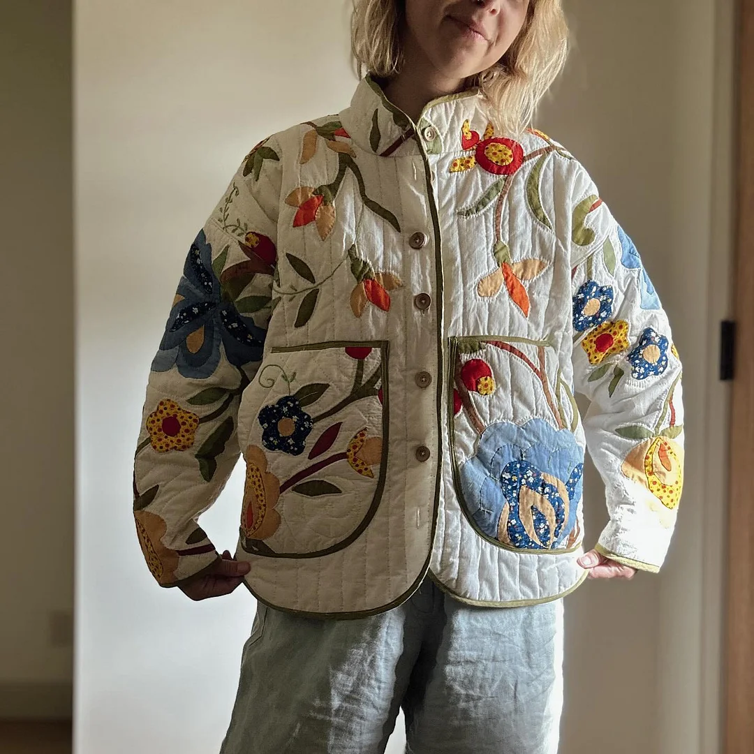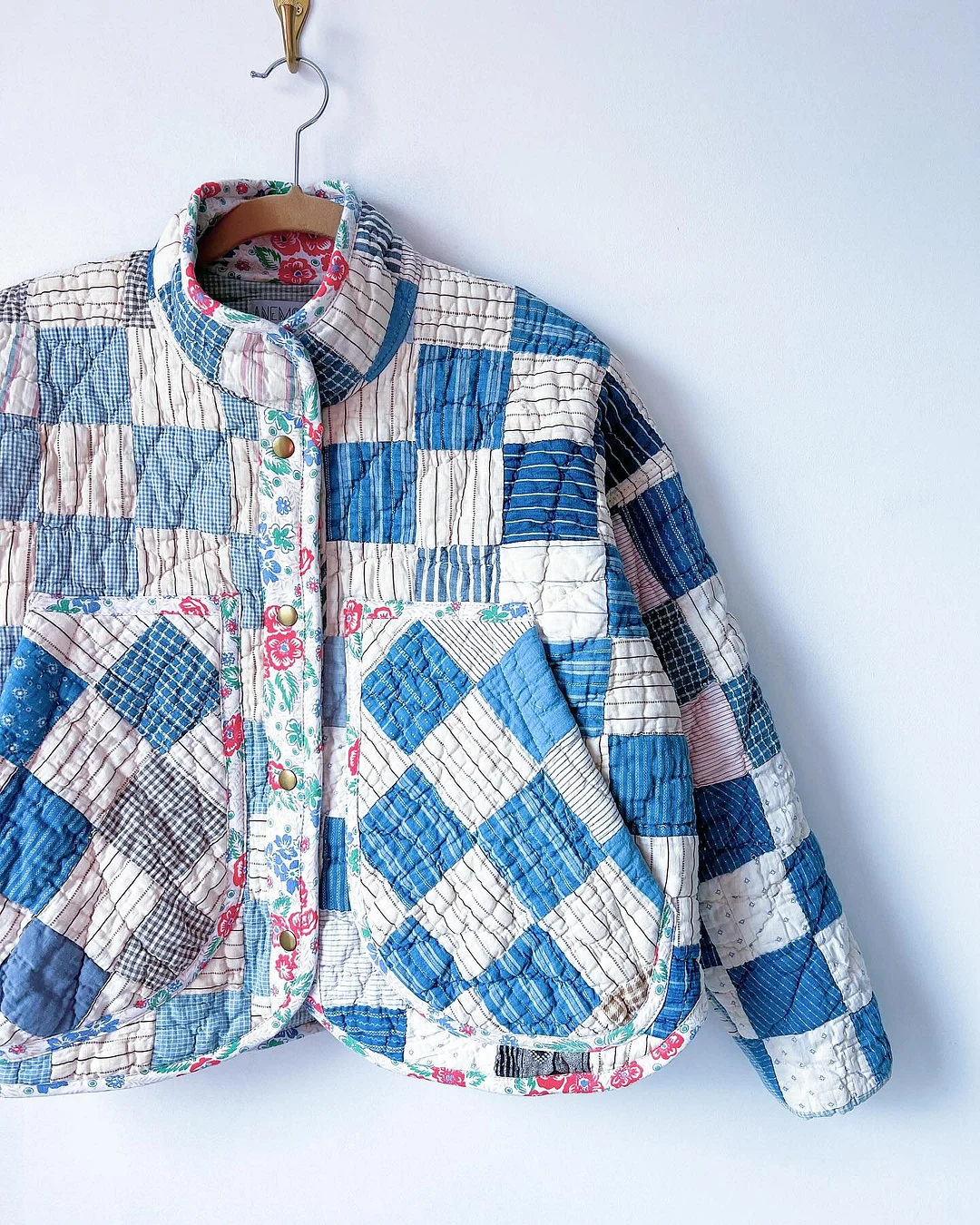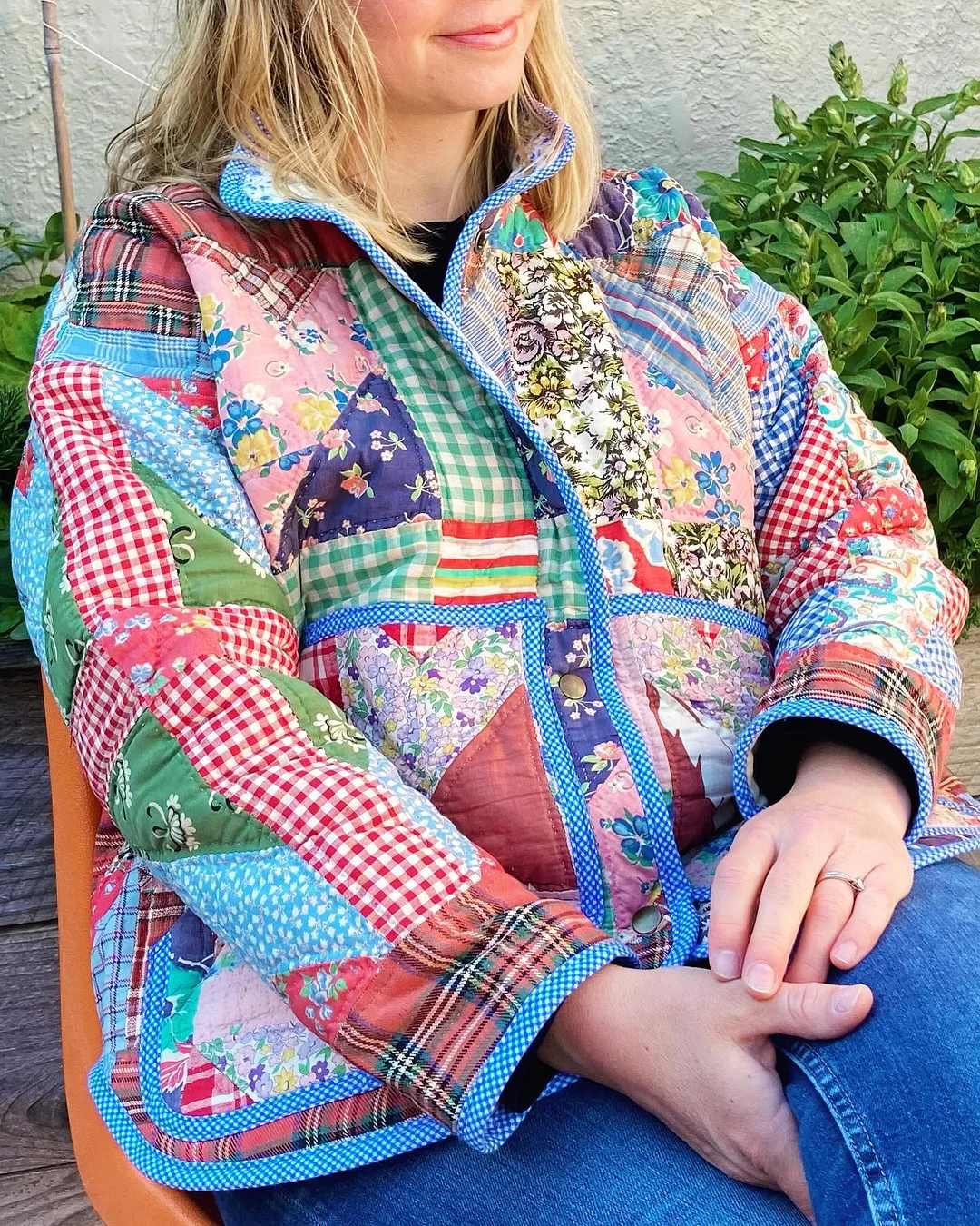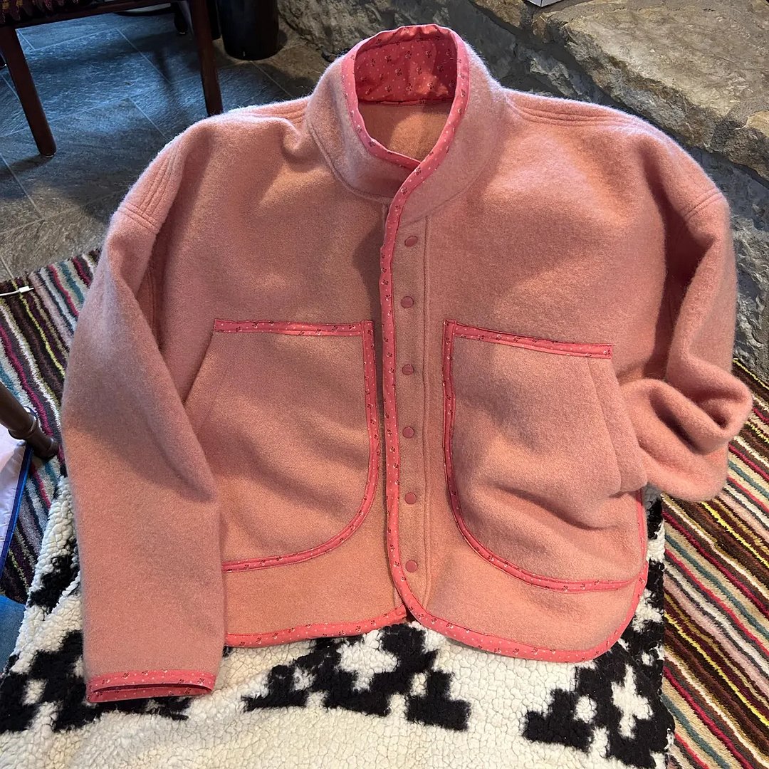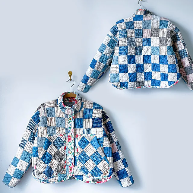 Use a treasured vintage quilt, a wool blanket, or new fabric—this pattern supports creative reuse and personalized style. A little contrast fabric gives a lovely pop at the collar and placket.