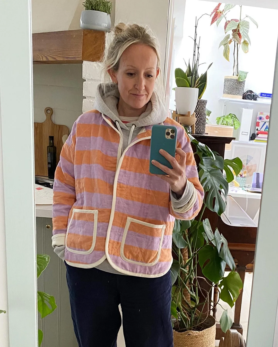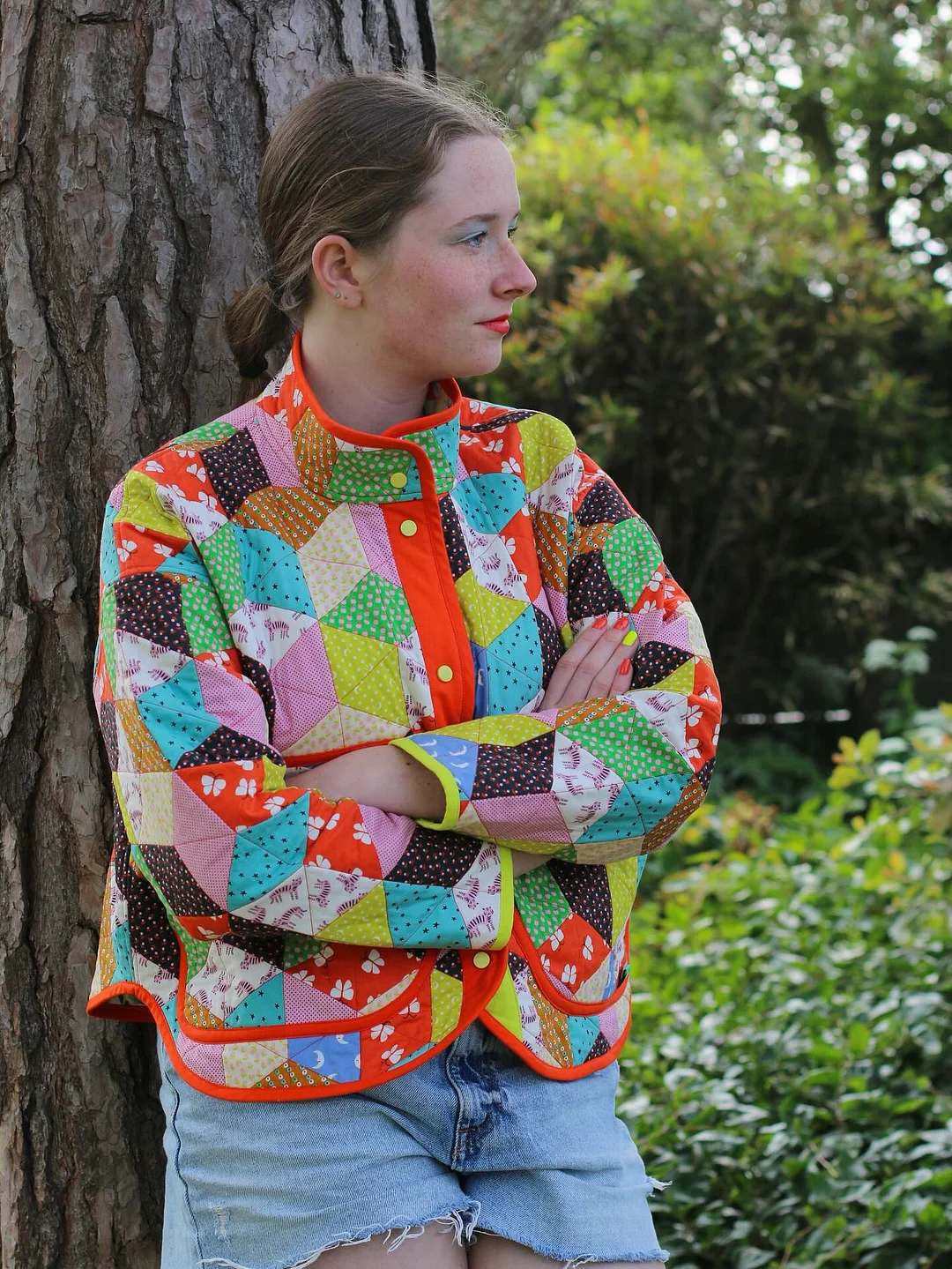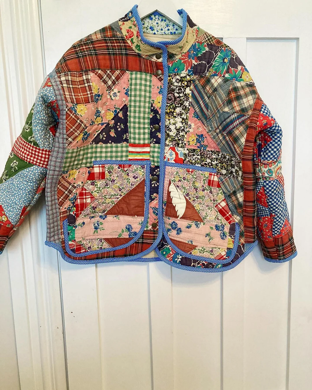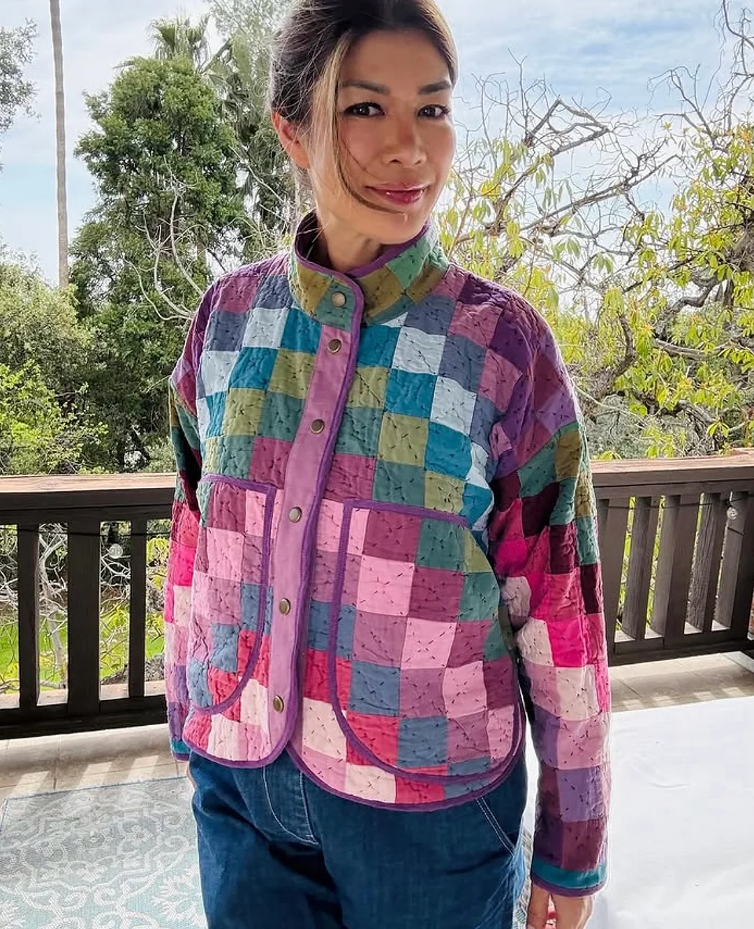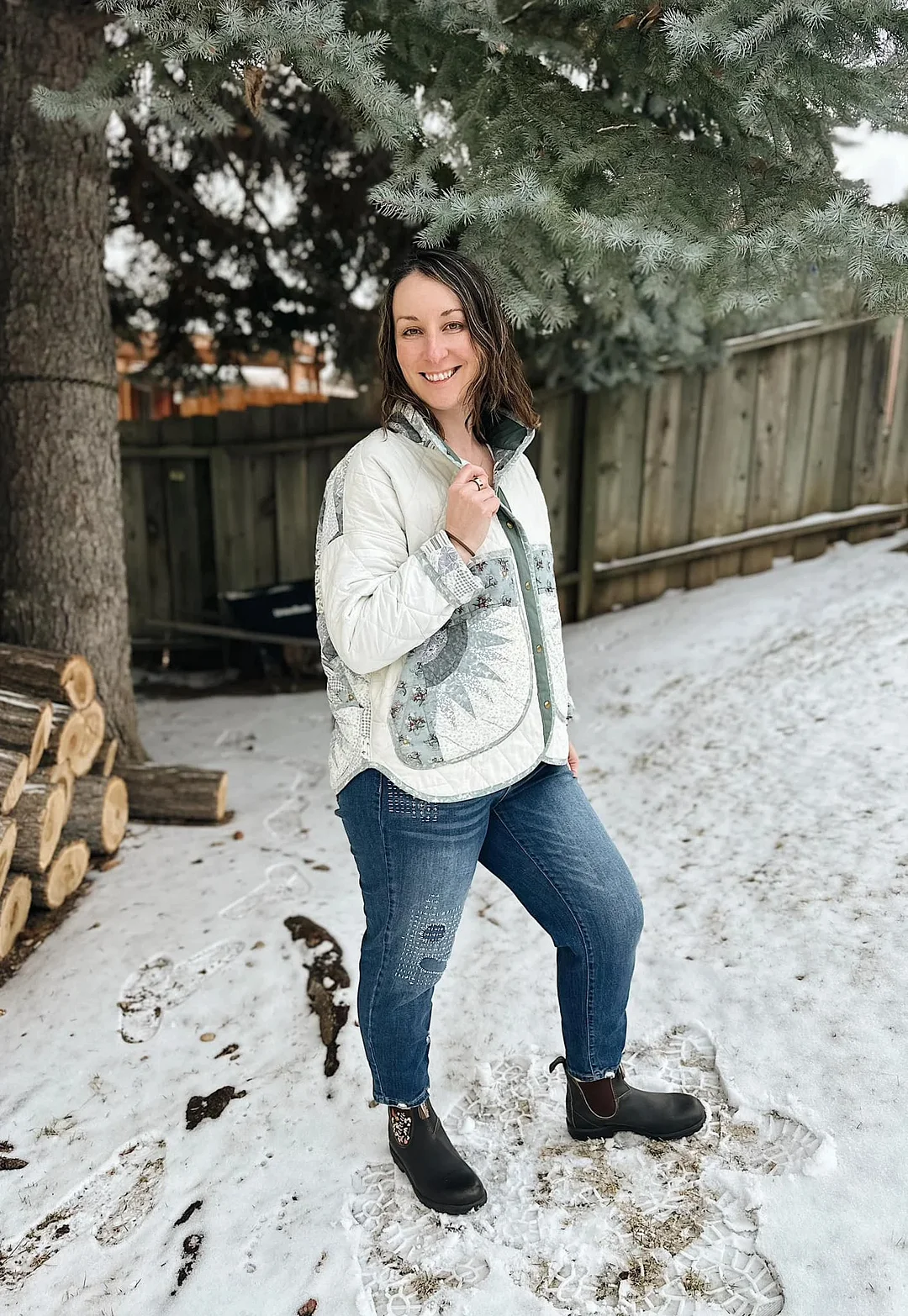 Use a treasured vintage quilt, a wool blanket, or new fabric—this pattern supports creative reuse and personalized style. A little contrast fabric gives a lovely pop at the collar and placket.