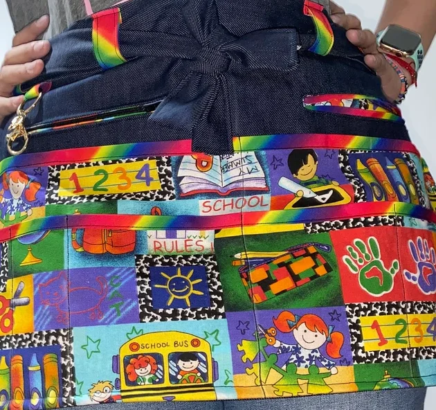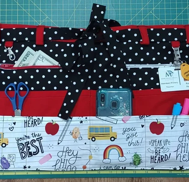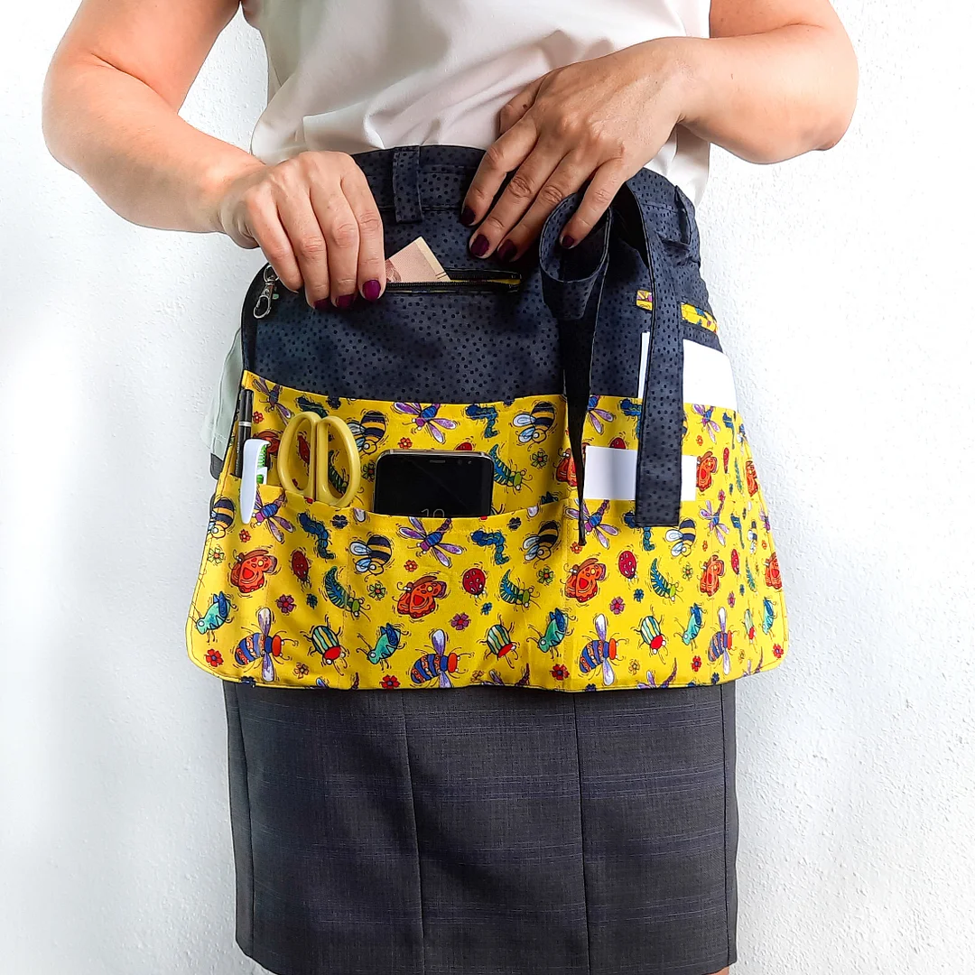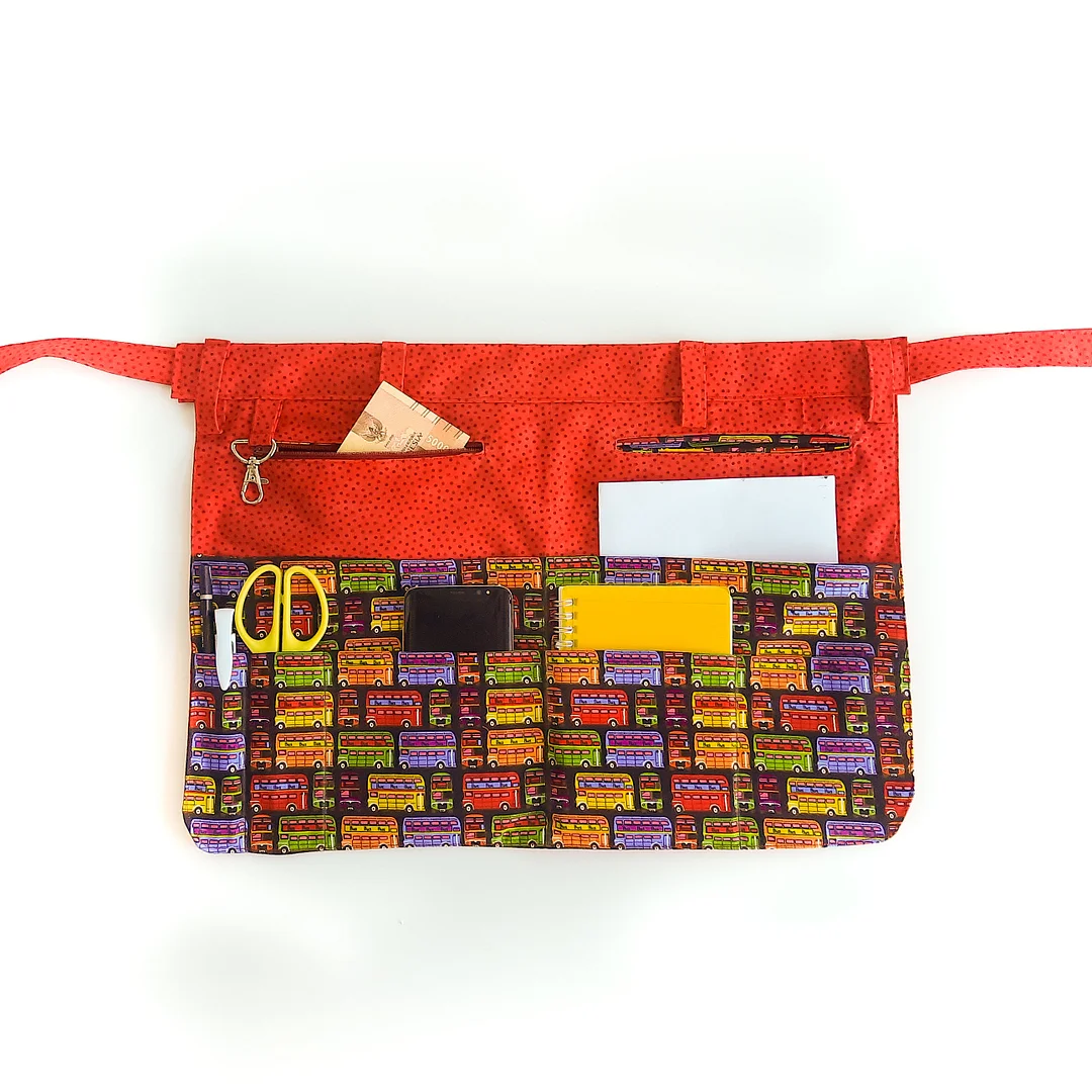 The apron has one long pocket that is roomy enough to hold your large scissors or rotary cutter, and two smaller pockets that can hold markers, spools of thread, seam ripper, or anything else you need to carry around.