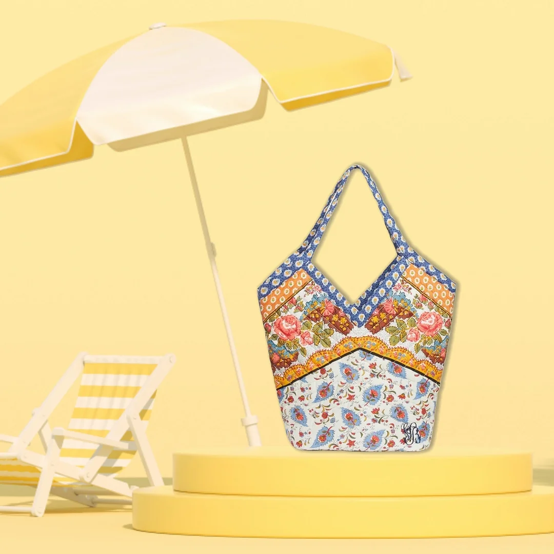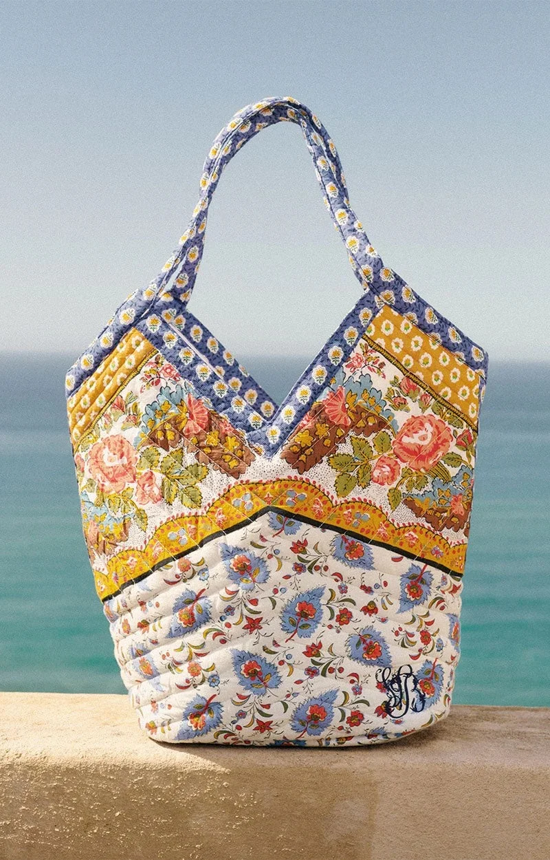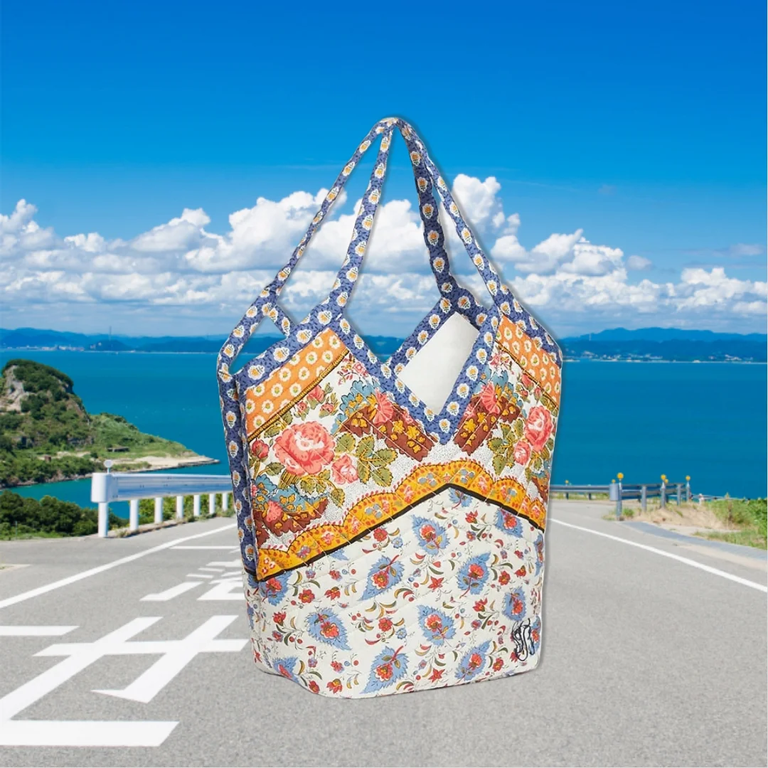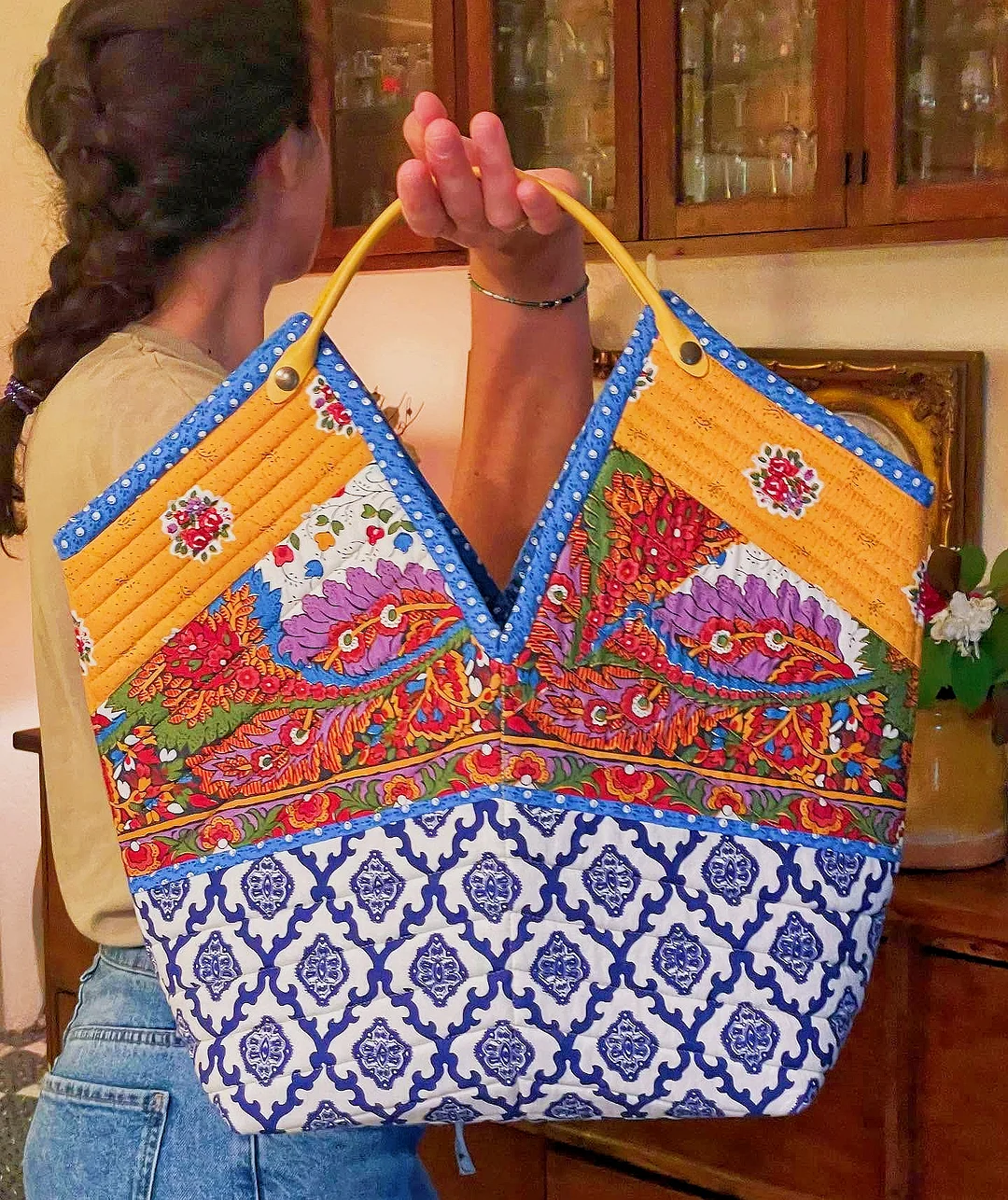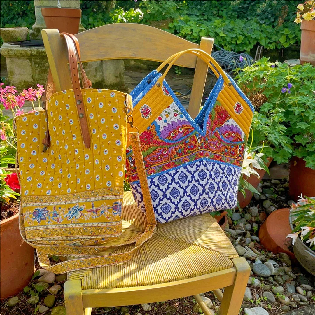 Stitch a lightweight patchwork bag with vibrant Souleiado motifs. Chic + casual for everyday warmth.