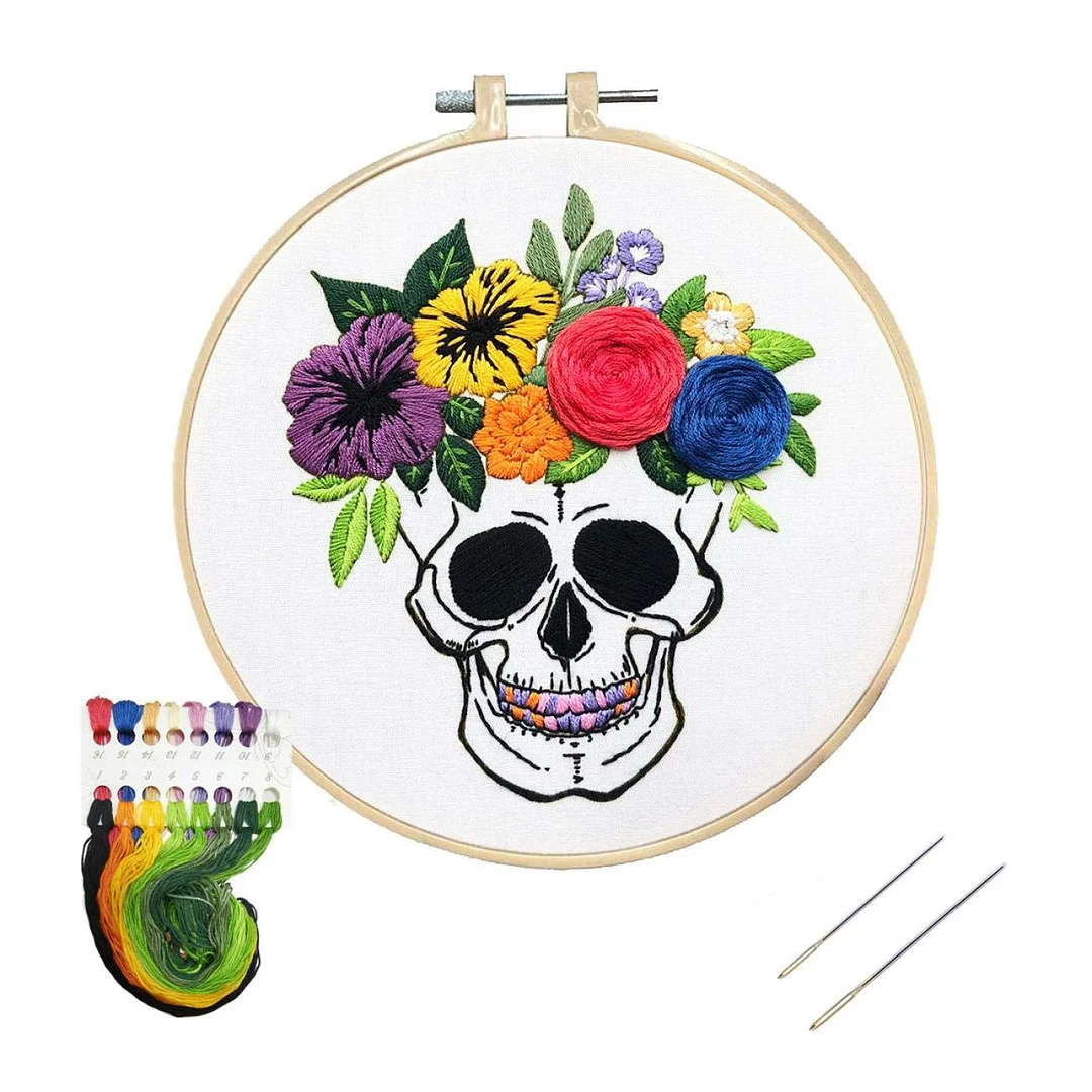This kit combines the intriguing mystique of skulls with the timeless elegance of blooming flowers, resulting in a stunning piece of embroidery that's both captivating and visually striking.