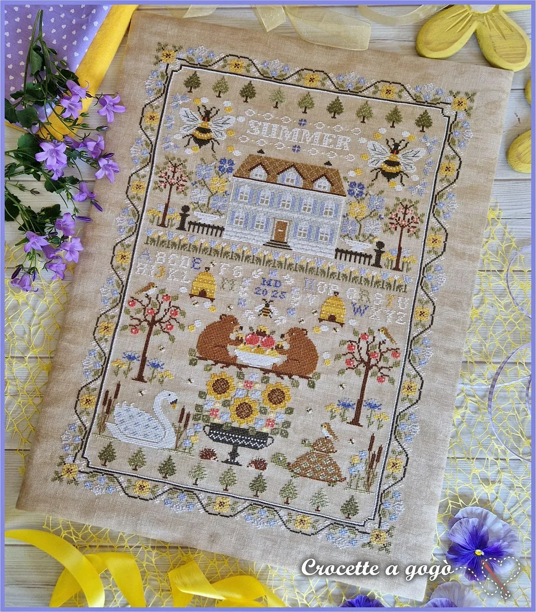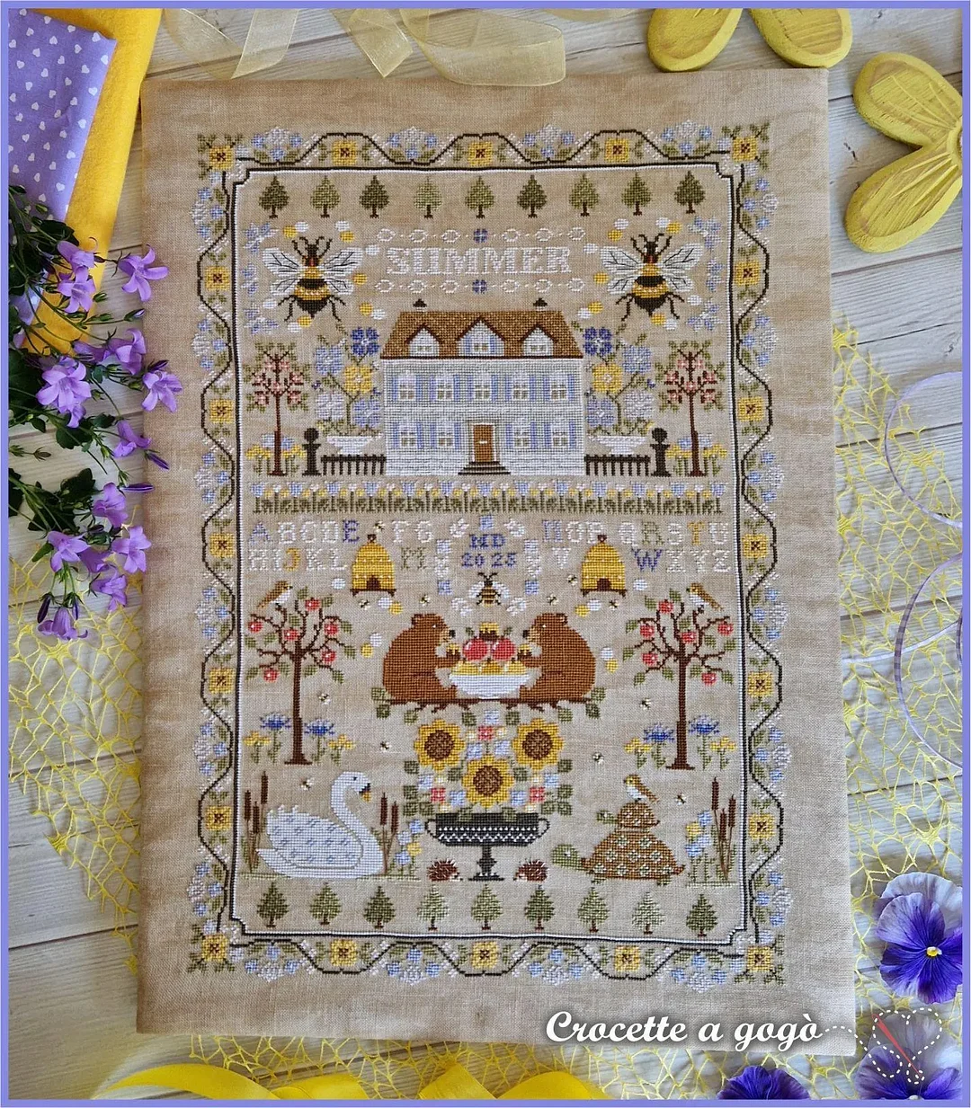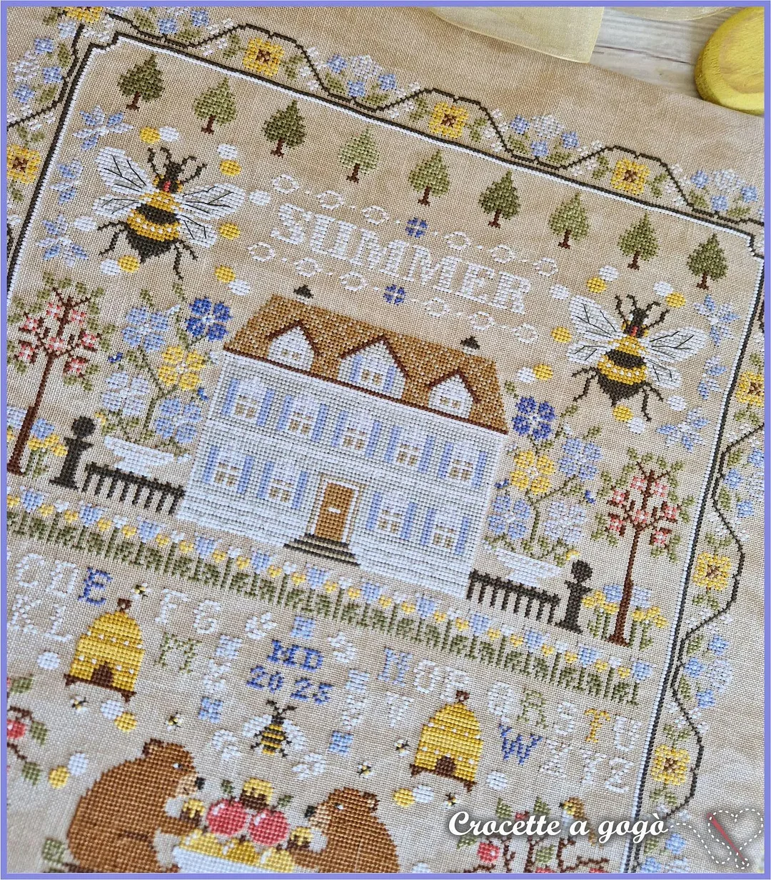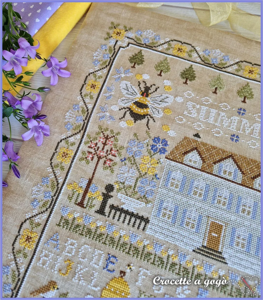 The alphabet isn’t just decorative—stitch your name or a date into your masterpiece. Every element (florals, bees, typography) harmonizes for a nostalgic summer feel.