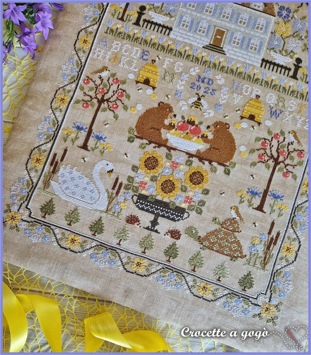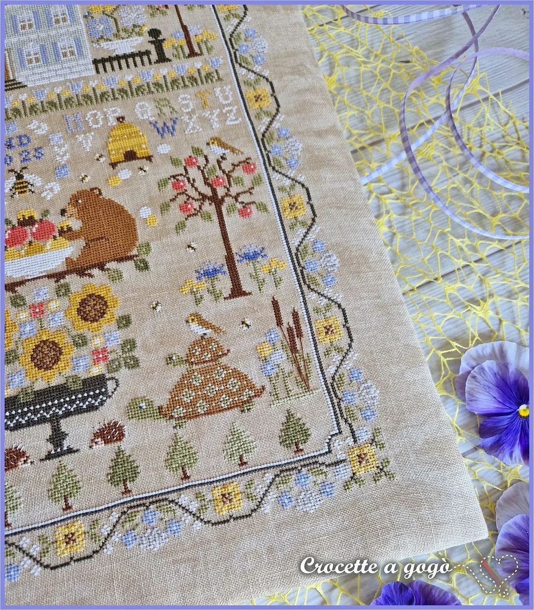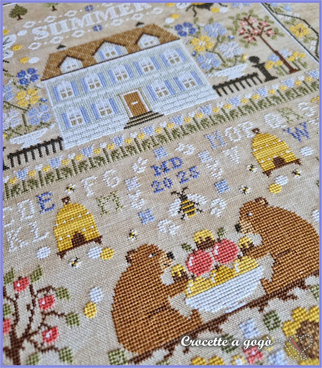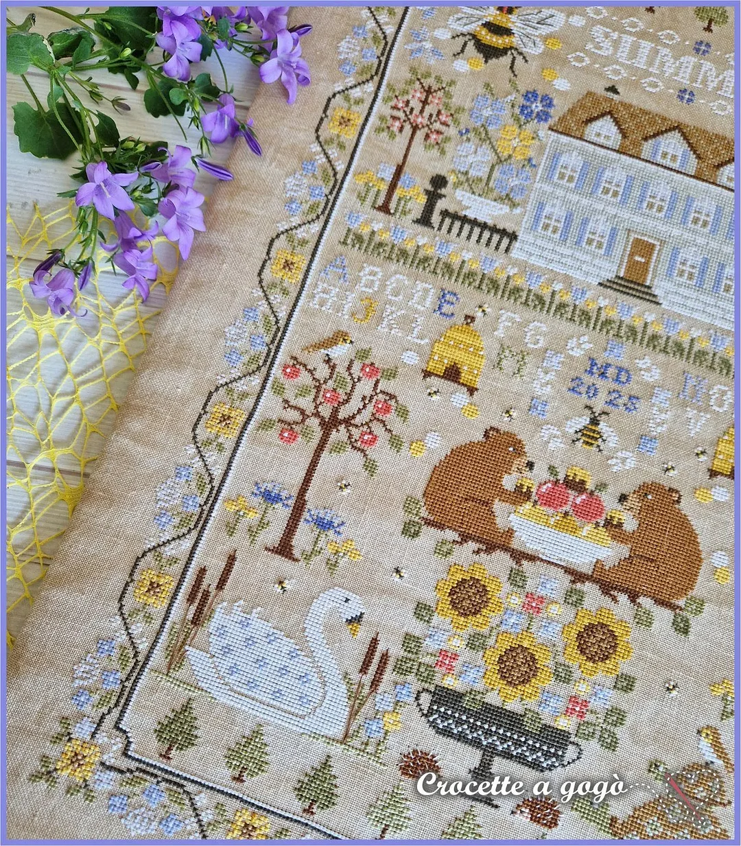 The alphabet isn’t just decorative—stitch your name or a date into your masterpiece. Every element (florals, bees, typography) harmonizes for a nostalgic summer feel.